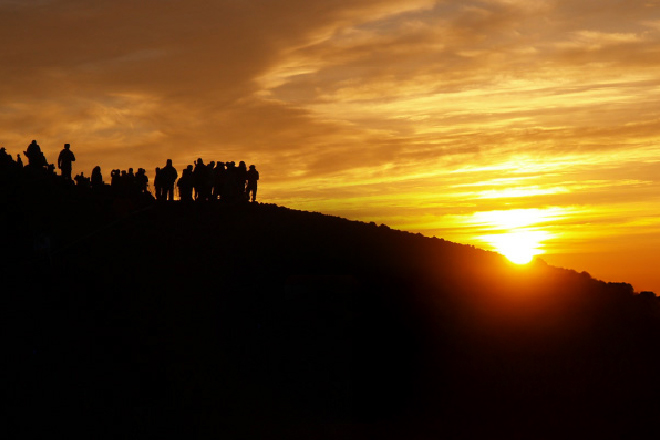 - 雲海から登る絶景の朝陽は、富士登山の最高のご褒美。刻一刻と雲の色が変わっていく、この瞬間のために登る 人もいるほど。