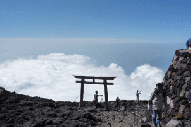 木花之佐久夜毘売命(このはなさくやひめのみこと)をお祀りする奥宮は、富士宮口から登った山頂に鎮座します。開山中は神職が登山者の安全を祈願する他、結婚式の奉仕や、富士山の溶岩の砂が含まれた御朱印の授与なども行っています。