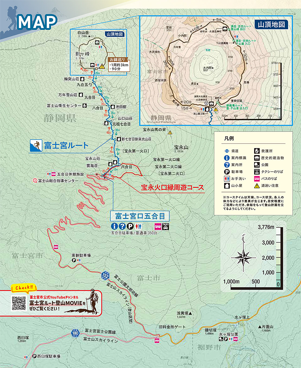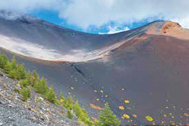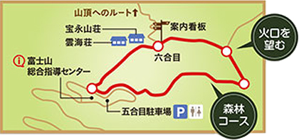 第一火口の迫力ある岩壁や、第二火口からは駿河湾・伊豆半島の眺望を楽しむことができます。森林の中の遊歩道を通って五合目駐車場まで戻る、富士山の変化に富んだ自然を体験できるコースです。