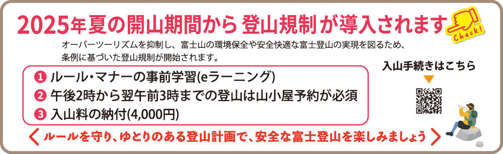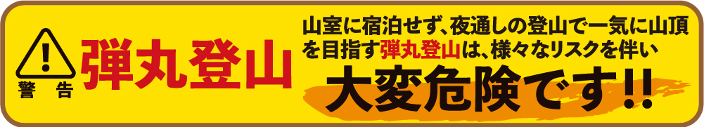 - 強い自己管理意識を持って、体調不良を感じたり、天候が悪くなりそうな時は、登山を中止し早めに下山してください。