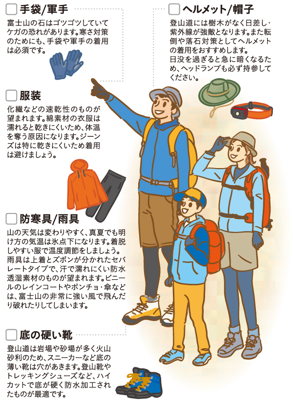 富士山では、100m上がるごとに気温が約0.6度下がります。山頂の平均気温は日中でも5度、明け方は0度以下になります。